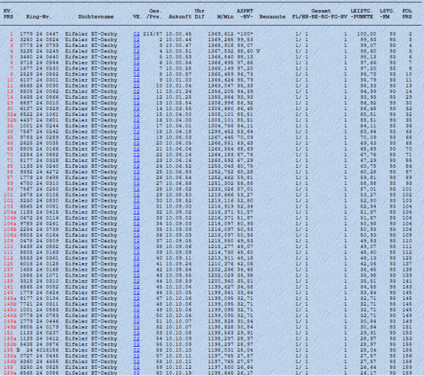 Eingesetzt wurden 206 Jungtauben. Mit einem Ergebnis von 75 RV- und 66 FG-Preisen absolvierte das Derby den 3. Preisflug.