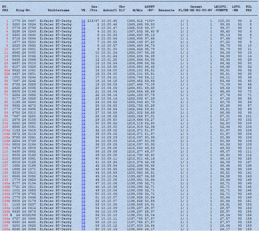 Eingesetzt wurden 165 Jungtauben. Mit einem Ergebnis von 48 RV-, 50 FG- und 40 RegV-Preisen absolvierte das Derby den 5. Preisflug.