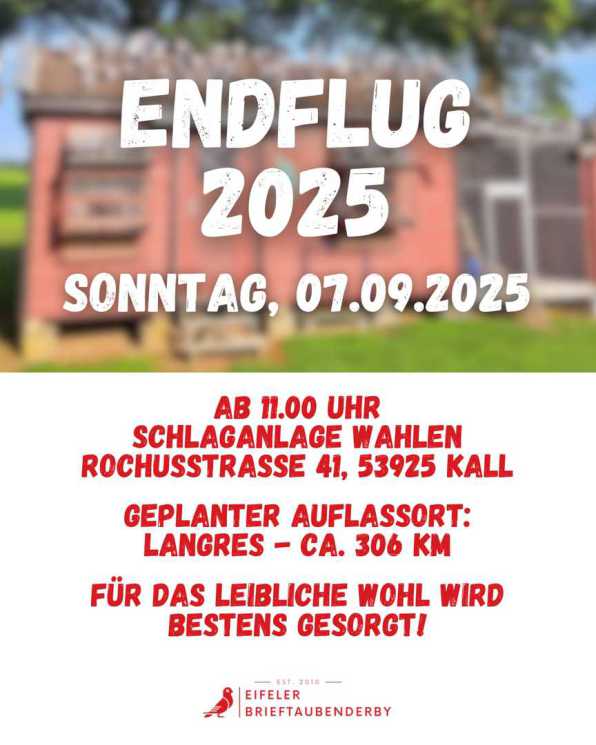 das Team des Eifeler Brieftaubenderby, lädt Euch herzlich zur diesjährigen Siegerehrung des 15. Eifeler Brieftaubenderby ein.